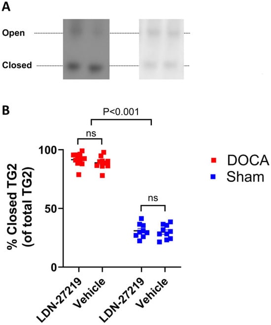 We then assessed the conformational state of TG2 in the renal tissue to examine whether it shifted to an open state under the influence of the DOCA. However, DOCA mice showed a larger proportion of TG2 in the closed form than the sham mice (Figure 6), and we found no influence of LDN-27219 treatment on the distribution between the closed and open forms of TG2. The original native blots are shown in Supplementary Figure S8.