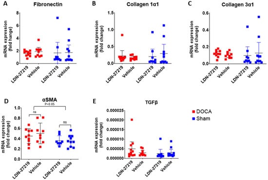 Renal mRNA expression based on qPCR for (A) fibronectin, (B) collagen 1α1, (C) collagen 3α1, (D) α–smooth muscle actin (αSMA) and (E) transforming growth factor beta (TGFβ) in DOCA mice treated with LDN-27219 (n = 12) or vehicle (n = 10) and in sham mice treated with LDN-27219 (n = 9) or vehicle (n = 10). The 2-way ANOVA was only significant for αSMA. Data show individual values and mean ± SEM. ns = non significant.