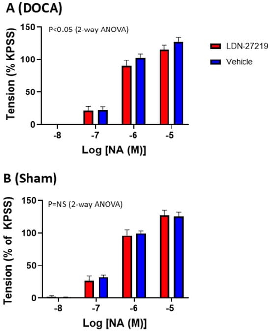 (A) Average constriction of mesenteric small arteries to noradrenaline (NA) in DOCA mice treated with LDN-27219 (n = 12) or vehicle (n = 10) and (B) average constriction to NA in sham mice treated with LDN-27219 (n = 9) or vehicle (n = 10). The responses are normalized to the tension obtained with KPSS. Data are mean ± SEM.