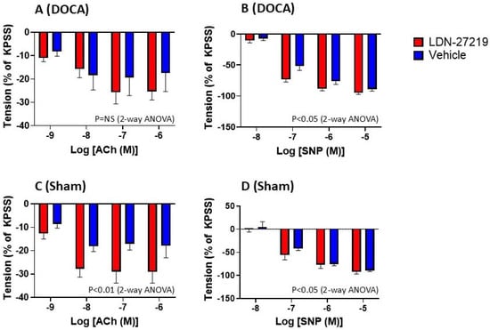 Mesenteric resistance artery relaxation to acetylcholine (ACh) and sodium nitropruside (SNP) following pre-constriction of the vessels with phenylephrine to achieve a tension corresponding to 60–80% of that induced by KPSS. Responses were normalized to the tension obtained with KPSS. The upper panel (A,B) shows data for DOCA mice treated with LDN-27219 (n = 12) or vehicle (n = 10), and the lower panel (C,D) shows data for sham mice treated with LDN-27219 (n = 9) or vehicle (n = 10). Data are mean ± SEM.