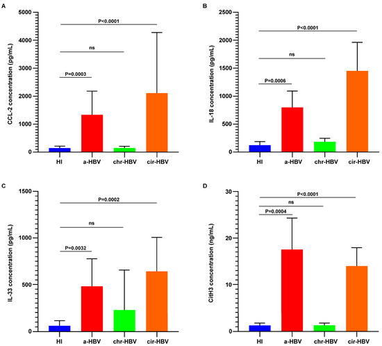 In cases of infection, chemokines have a crucial role; they can enhance the recruitment of immune cells to the sites of inflammation and contribute to the elimination of pathogens [50,51]. Specifically, CCL2 represents an activator of macrophages, monocytes, and neutrophils, driving events of uncontrolled inflammation and fibrosis [52,53,54]. Similarly, IL-18, a member of the IL-1 cytokine superfamily, activates neutrophils, contributing to the early phases of inflammatory and innate immune responses [55,56,57,58]. Circulating IL-18 levels are elevated in several inflammatory conditions [59,60], while data have also linked the cytokine to liver fibrosis [61]. In addition, IL-33, a chromatin-associated nuclear cytokine from the IL-1 superfamily, is released upon cellular damage and exerts potent actions upon infection [62]. In liver diseases, IL-33 directly affects innate lymphoid cells as well as hepatic stellate cells (HSCs) that produce collagen [63,64]. Our data, obtained from a bead-based immunoassay, are consistent with these observations. They show that CCL2, IL-18, and IL-33 are involved in distinct stages of the disease and, particularly, in the onset of the disease, as well as in the hepatic fibrosis that may occur during the chronicity. Therefore, we can suggest that inflammatory events as well as fibrotic manifestations of HBV could be influenced by the aforementioned secreted proteins.