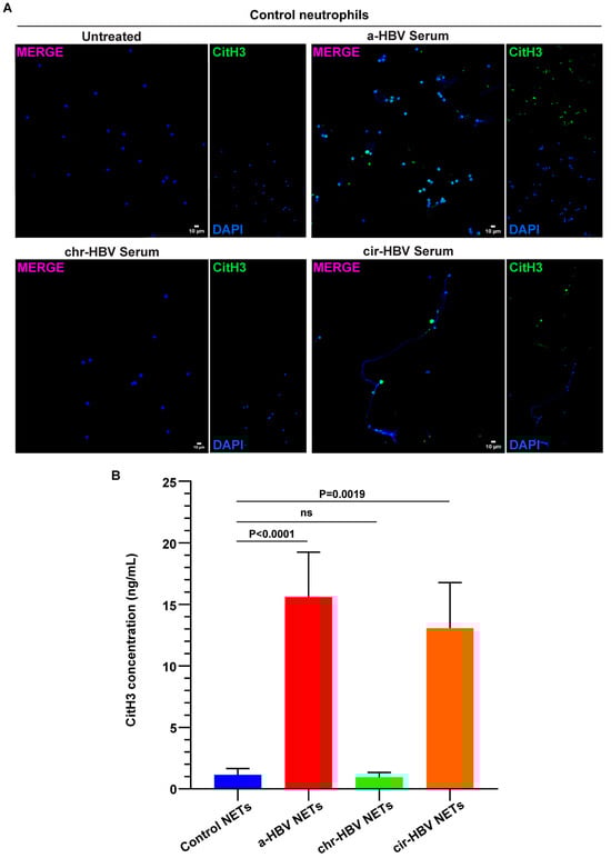 Figure 2. The inflammatory a-HBV and cir-HBV microenvironment induces NET formation in vitro. (A) Fluorescence confocal microscopy images showing citrullinated histone H3 (CitH3) staining, representing NETs (blue: DAPI; green: CitH3; original magnification: 400×). A representative example of 6 independent experiments is shown. (B) Levels of CitH3, representing NET release, after in vitro stimulation of control neutrophils with serum from HBV patients (n = 11). For (B), data are shown as mean ± SD, Friedman test, followed by Dunn’s multiple comparison test. For (B), all conditions were compared to control NETs. Statistically significant: p < 0.05. ns: non-statistically significant. a-HBV: acute HBV; chr-HBV: chronic HBV infection under treatment; cir-HBV: early cirrhotic stage.