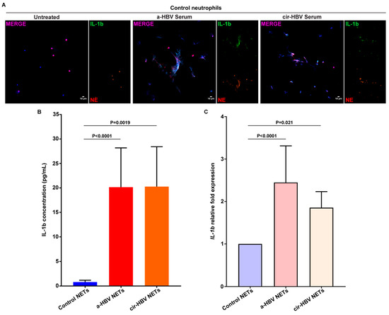 Figure 3. IL-1b-bearing NETs are formed in the presence of a-HBV or cir-HBV microenvironment in vitro. (A) Fluorescence confocal microscopy images showing neutrophil elastase (NE) and interleukin(IL)-1b staining (blue: DAPI; red: NE; green: IL-1b; original magnification: 400×). A representative example of 6 independent experiments is shown. (B) Concentration of IL-1b on in vitro isolated NETs, after stimulation of control neutrophils with serum from HBV patients (n = 11 independent experiments). (C) IL-1b expression in control neutrophils treated with HBV serum, as assessed by RT-qPCR (n = 6 independent experiments). For (B,C), data are shown as mean ± SD, Friedman test, followed by Dunn’s multiple comparison test. For (B,C), all conditions were compared to control NETs and untreated, respectively. Statistically significant: p < 0.05. a-HBV: acute HBV; cir-HBV: early cirrhotic stage.