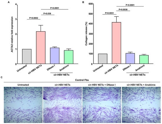 Figure 4. The migratory/wound healing dynamic and collagen production of fibroblasts are enhanced by cir-HBV NETs in vitro. (A) Smooth muscle actin alpha 2 (ACTA2) expression (n = 6 independent experiments), (B) collagen production (n = 6 independent experiments), and (C) migratory/wound healing capacity of control fibroblasts (Fbs) upon stimulation with in vitro isolated cir-HBV NETs (original magnification: 40×). For (C), a representative example of 6 independent experiments is shown. In all experiments, NET structures were dismantled with DNase I and interleukin(IL)-1b signaling was blocked in Fbs using a recombinant human IL-1 receptor antagonist (Anakinra). For (A,B), data are shown as mean ± SD, Friedman test, followed by Dunn’s multiple comparison test. For (A,B), all conditions were compared to untreated. Statistically significant: p < 0.05. cir-HBV: early cirrhotic stage.