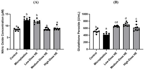 The nitric oxide (NO) level in the microplastics group was significantly increased (p < 0.05) compared to the control and treated groups (Figure 1). Conversely, glutathione peroxidase (GPx) activity was significantly decreased (p < 0.05) in the microplastics group compared to the control and treated groups. After 6 weeks of treatment with HE, NO levels were significantly reduced (p < 0.05), particularly with medium and high doses of HE, compared to the microplastics group. In contrast, GPx activity was significantly increased (p < 0.05).