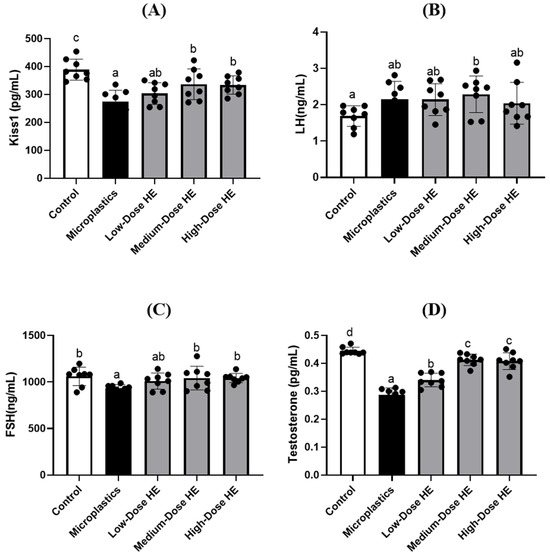 Kiss1 level was significantly (p < 0.05) reduced in the microplastics group compared to the control group, as shown in Figure 3. Treatment with HE for 6 weeks significantly (p < 0.05) increased Kiss1 levels, especially for the medium and high doses of HE. The reproductive hormones, such as luteinizing hormone (LH), follicle-stimulating hormone (FSH), and testosterone, were measured at the end of the experiment (Figure 3). FSH and testosterone levels were significantly different (p < 0.05) in the microplastics group compared to the control group. However, these levels significantly (p < 0.05) improved after treatment with medium and high doses of HE for 6 weeks. On the other hand, there were no significant differences (p > 0.05) in LH levels between the microplastics and control groups, as well as the treated groups.