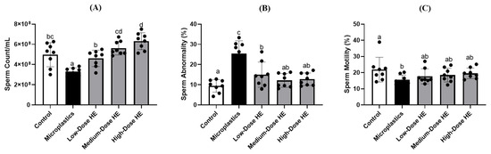 The rat sperm count in the microplastics group was significantly reduced (p < 0.05) compared to the control and treated groups (Figure 4). In contrast, sperm abnormalities were significantly increased (p < 0.05) in the microplastics group compared to the control and treated groups. These sperm properties were significantly (p < 0.05) improved after treatment with HE for 6 weeks. Additionally, there was no significant difference (p > 0.05) in sperm motility between the microplastics and treated groups.