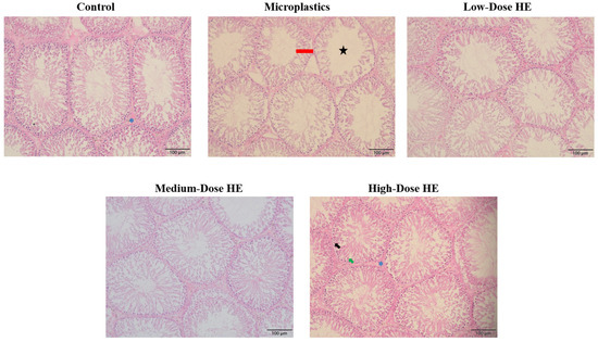 Figure 5 shows the increase in the seminiferous tubules’ lumen area/space in the microplastics group, as well as the shrinkage of the seminiferous tubule epithelium. This condition indicates a low concentration of elongated spermatids and sperm cells. As reported by previous studies, the seminiferous tubule lumen is the site where developing sperm cells are located [42,43]. The morphology of the seminiferous tubules improved with treatment using HE for 6 weeks. This condition confirms that HE successfully protects the testis from the adverse effects of polystyrene microplastics.
