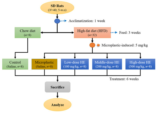Flowchart of high-fat-diet- and microplastic-induced rats treated with Hericium erinaceus mycelium (HE) for 6 weeks. HE, Erinacine A-enriched H. erinaceus mycelium; HFD, high-fat diet; SD, Sprague Dawley.