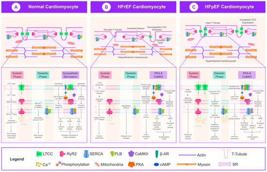 Schematic representation of L-type calcium channel (LTCC) behavior in normal, HFrEF, and HFpEF cardiomyocytes. (A) Normal cardiomyocyte showing organized T-tubules and tightly coupled LTCC–RyR2 interactions for efficient systolic Ca2⁺ release and diastolic reuptake. (B) HFrEF cardiomyocyte with disrupted T-tubules, increased LTCC–RyR2 distance, downregulated LTCC expression, maladaptive phosphorylation, and delayed Ca2⁺ reuptake—leading to systolic dysfunction and arrhythmogenesis. (C) HFpEF cardiomyocyte with preserved or increased LTCC expression, intact T-tubules, elevated diastolic Ca2⁺, and blunted β-adrenergic responsiveness—leading to preserved EF but impaired relaxation. The figure illustrates phase-specific Ca2⁺ flux, LTCC gating, kinase signaling, and EC coupling efficiency across phenotypes. Abbreviations: LTCC, L-type calcium channel; RyR2, ryanodine receptor 2; SERCA, sarcoplasmic reticulum Ca2⁺-ATPase; PLB, phospholamban; CaMKII, calcium/calmodulin-dependent protein kinase II; β-AR, beta-adrenergic receptor; PKA, protein kinase A; cAMP, cyclic AMP; HFrEF, heart failure with reduced ejection fraction; HFpEF, heart failure with preserved ejection fraction; EADs, early afterdepolarizations.