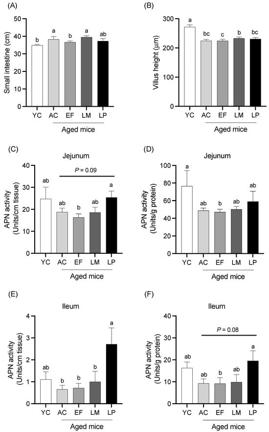 Length, villous height, and mucosal APN activity of the small intestine. (A) Small intestinal length; (B) villous height; and APN activity in the jejunum (C,D) and ileum (E,F), expressed per tissue length (units/cm) and protein content (units/g protein). Data are presented as mean ± SEM (n = 6 per group). Following the analysis of variance by Bartlett’s test, data were analyzed by a two-tailed one-way ANOVA (equal variances) or the Kruskal–Wallis test (unequal variances), and then by post hoc multiple comparisons tests, as needed. Values without a shared letter indicate statistically significant differences (p < 0.05). Data are representative of two independent experiments. Abbreviations: YC: young mice fed a Control diet; AC: aged mice fed a Control diet; EF: aged mice fed an Enterococcus faecalis-supplemented diet; LM: aged mice fed a Leuconostoc mesenteroides-supplemented diet; LP: aged mice fed a Lactiplantibacillus plantarum-supplemented diet; APN: aminopeptidase N.