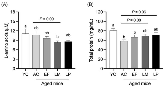 (A) L-amino acids and (B) total protein levels in serum. Data are presented as mean ± SEM (n = 6 per group). Following the analysis of variance by Bartlett’s test, data were analyzed by a two-tailed one-way ANOVA (equal variances) or the Kruskal–Wallis test (unequal variances), and then by post hoc multiple comparisons tests, as needed. Values without a shared letter indicate statistically significant differences (p < 0.05). Data are representative of two independent experiments. Abbreviations: YC: young mice fed a Control diet; AC: aged mice fed a Control diet; EF: aged mice fed an Enterococcus faecalis-supplemented diet; LM: aged mice fed a Leuconostoc mesenteroides-supplemented diet; LP: aged mice fed a Lactiplantibacillus plantarum-supplemented diet; APN: aminopeptidase N.