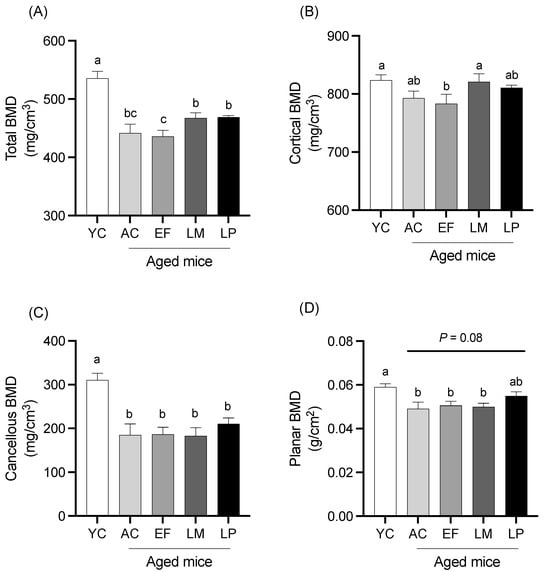 BMD of the femur. BMD of (A) total bone, (B) cortical bone, (C) cancellous bone, and (D) planar bone. Data are presented as mean ± SEM (n = 6 per group). Following the analysis of variance by Bartlett’s test, data were analyzed by a two-tailed one-way ANOVA (equal variances) or the Kruskal–Wallis test (unequal variances), and then by post hoc multiple comparisons tests, as needed. Values without a shared letter indicate statistically significant differences (p < 0.05). Data are representative of two independent experiments. Abbreviations: YC: young mice fed a Control diet; AC: aged mice fed a Control diet; EF: aged mice fed an Enterococcus faecalis-supplemented diet; LM: aged mice fed a Leuconostoc mesenteroides-supplemented diet; LP: aged mice fed a Lactiplantibacillus plantarum-supplemented diet; APN: aminopeptidase N.