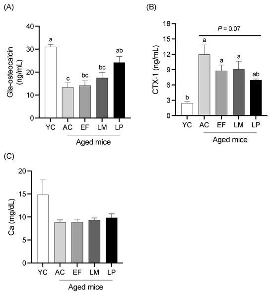 Serum levels of Gla-Osteocalcin (a bone formation marker), CTX-1 (a bone resorption marker), and calcium are shown in Figure 4. Serum Gla-Osteocalcin levels in the AC, EF, and LM groups were significantly lower than that in the YC group, while the LP group exhibited significantly higher Gla-Osteocalcin levels compared to the AC group (Figure 4A). The serum CTX-1 levels in the AC, EF, and LM groups were significantly higher than that in the YC group. In contrast, the CTX-1 level in the LP group tended to be lower than in the AC group (p = 0.07) (Figure 4B). No significant differences in serum calcium levels were observed among the groups (Figure 4C).