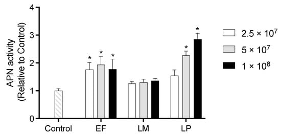 APN activity of IEC-6 cells co-cultured with heat-killed LAB at 2.5 × 107, 5 × 107, or 1 × 108 cells per well. Data are representative of three independent experiments. Each experiment was conducted in quadruplicate. Data are presented as mean ± SEM. Following analysis of variance by Bartlett’s test, data were analyzed by two-tailed one-way ANOVA (equal variances) and then by post hoc multiple comparisons tests. * Statistically significant differences compared to Control (p < 0.05). Abbreviations: Control: cells without co-culture; EF: cells co-cultured with Enterococcus faecalis; LM: cells co-cultured with Leuconostoc mesenteroides; LP: cells co-cultured with Lactiplantibacillus plantarum; APN: aminopeptidase N.