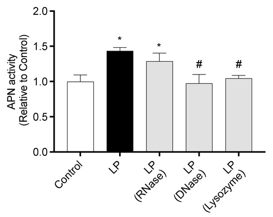 APN activity of IEC-6 cells co-cultured with RNase-, DNase-, or lysozyme-treated LP is shown in Figure 6. APN activity in cells co-cultured with untreated LP or RNase-treated LP was significantly higher than that in Control cells. In contrast, APN activity in cells co-cultured with DNase- or lysozyme-treated LP was significantly lower than that in cells co-cultured with untreated LP.