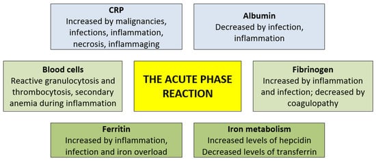 The effects of the acute-phase reaction on iron metabolism are complex; ferritin levels increase whereas, at the same time, transferrin levels are decreased []. The serum levels of iron are, in addition, decreased and this seems to be at least partly due to the accumulation of iron in macrophages []. Furthermore, the effect of inflammation/an acute-phase reaction on the levels of circulating normal myeloid cells are divergent, neutrophils are increased, thrombocytosis is also common, and many patients have anemia []. Finally, the function of the hepatocytes that express/release many of the acute-phase proteins is altered and there are additional systemic neuroendocrine changes (e.g., increased catecholamines, corticotropin and cortisone), several metabolic changes (e.g., a loss of muscle and negative nitrogen balance, increased vasopressin, decreased IGF-1, increased hepatic lipogenesis, but increased lipolysis in adipose tissue) and changes in not-protein plasma constituents (e.g., hypozinchemia, hypercupremia and increased glutathione) [,]. The figure presents protein biomarkers of inflammation (blue), normal peripheral blood cells (including platelets)/coagulation (light green) and biomarkers of iron metabolism (dark green).