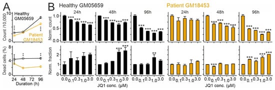 First, we tested whether the drug affects the number and viability of fibroblasts. As shown in Figure 1A, patient-derived fibroblasts carrying the I1061T variant attained lower numbers and showed a lower fraction of propidium iodide-positive (dead) cells compared to fibroblasts from the healthy donor. JQ1 inhibited cell growth and enhanced the percentage of dead cells compared to vehicle (dimethylsulfoxide; DMSO) in a dose- and time-dependent manner, regardless of the genotype (Figure 1B). Anti-proliferative and toxic effects of JQ1 at high doses were reported in dermal fibroblasts [] and in immortalized cell lines [,].