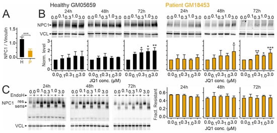 Next, we tested how JQ1 affects NPC1 protein levels in human skin fibroblasts. These experiments followed up on our previous observation that the drug modifies components mediating lipid homeostasis, including NPC1, in a hepatocarcinoma cell line []. Immunoblotting revealed lower levels of the I1061T variant compared to the normal version of NPC1 in fibroblasts (Figure 2A), in line with previous studies [,,]. JQ1 enhanced protein levels of NPC1 in a concentration-dependent manner compared to vehicle-treated (JQ1 concentration zero) cultures independently from the genotype, with robust changes occurring after 72 h of treatment (Figure 2B). The fraction of endoglycosidase H (EndoH)-resistant NPC1 protein was unaffected by JQ1 regardless of the variant (Figure 2C), indicating that JQ1 does not modify protein glycosylation under our experimental conditions.