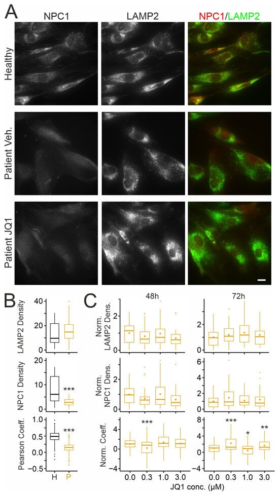 Next, we asked whether JQ1-induced NPC1 protein reaches the endosomal–lysosomal system using double immunocytochemical staining with antibodies against NPC1 and against the endosomal–lysosomal marker LAMP2 (Figure 3A). Quantitative analyses of regions of interest (ROIs) confirmed lower levels of NPC1 and of its colocalization with LAMP2 in patient-derived fibroblasts compared to healthy donor cells (Figure 3B). Treatment of patient-derived cells with JQ1 for 48 or 72 h did not enhance the density of LAMP2 or NPC1-positive clusters (Figure 3A,C) and only moderately affected the colocalization of NPC1 and LAMP2 (Figure 3C).