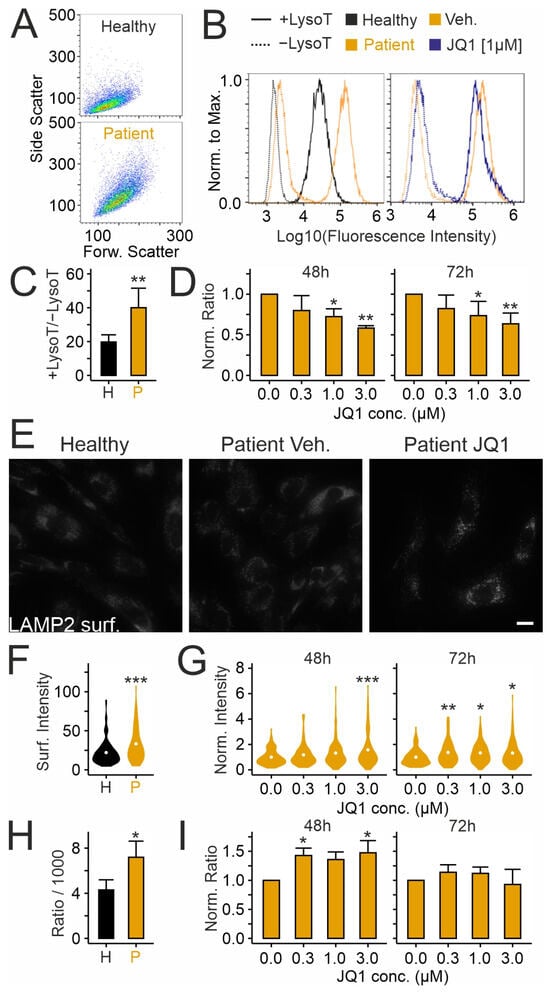 We tested next whether JQ1 affects the expansion of the acidic (lysosomal) compartment, a cellular hallmark of NPC1 deficiency, using lysotracker, a pH-sensitive fluorescent dye [,,] (Figure 4A–D). Flow cytometry of lysotracker-labeled fibroblasts revealed a higher cell complexity and increased fluorescence signal in cells carrying the disease-causing variant of NPC1 compared to cells from a healthy donor (Figure 4A–C). Treatment of patient-derived cells with JQ1 reduced the lysotracker signal in a dose-dependent manner regardless of the treatment duration (Figure 4D). This effect may have been due to exocytotic release of lysosomal content []. To address this, we used two complementary assays [,,]. First, immunocytochemical staining of LAMP2 in non-permeabilized cells revealed the presence of LAMP2 on the cell surface following fusion of the lysosome with the plasma membrane. Second, detection of hexosaminidase activity in the culture medium revealed the cellular release of lysosomal enzymes (Figure 4E–I). The assays showed enhanced basal LAMP2 surface expression (Figure 4E,F) and extracellular hexosaminidase activity (Figure 4H) in patient-derived fibroblasts compared to fibroblasts from a healthy donor, in agreement with a previous study []. Treatment with JQ1 further increased both the LAMP2 surface expression (Figure 4G) and extracellular hexosaminidase activity in a time- and concentration-dependent manner (Figure 4I), suggesting that the drug induces release of lysosomal material.