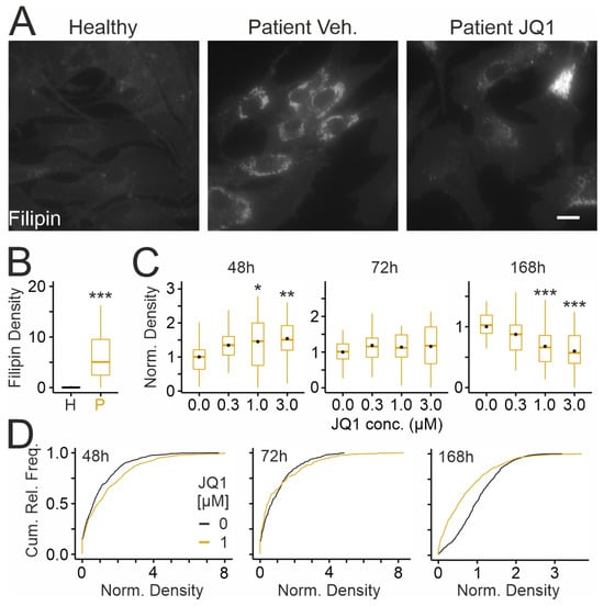 JQ1 affects cholesterol accumulation in cultured skin fibroblasts from an NPCD patient: (A) Fluorescence micrographs of cultured fibroblasts from a healthy donor (GM056549; left) and a NPCD patient (GM18453) following treatment for 72 h with vehicle (DMSO; middle) or with JQ1 (3 µM; right). After chemical fixation, cells were subjected to cytochemical staining with filipin to reveal the distribution of unesterified cholesterol. Scale bar: 20 µm. (B,C) Boxplots showing densities of filipin-positive puncta in fibroblasts from the healthy (H) and the patient (P) donor (B) and following treatment with JQ1 for indicated durations and concentrations (C). Black circles indicate mean values. Values in (C) were normalized to the means of vehicle-treated cultures. Asterisks indicate statistically significant changes [*, p < 0.05; **, p < 0.01; ***, p < 0.001; (B): t test; n = 45/45 healthy/patient images from 4 preparations with 10–11 images per preparation and condition and 6–30 ROIs per image; (C): One-way ANOVA with Tukey’s post hoc test; 48 h: 33–34 images per concentration from 3 preparations with 10–11 images per preparation and condition and 1–24 ROIs per image; 72 h: 33–34 images per concentration from 3 preparations with 10–12 images per preparation and condition and 6–27 ROIs per image; 168 h: 33–34 images per concentration from 3 preparations with 10–12 images per preparation and condition and 3–32 ROIs per image]. (D) Cumulative relative frequency plots showing densities of filipin-positive puncta in fibroblasts from the NPCD patient (GM18453) following treatment for indicated periods with JQ1 (1 µM) or with vehicle [DMSO; 48 h, vehicle: 450 ROIs/1 µM: 462; 72 h, vehicle: 527/434; 168 h: 818/519; same data as shown in panel (C)]. Note the time-dependent effects of JQ1 increasing and decreasing the densities at 48 h and 168 h, respectively, and the dual effect at 72 h with 30 and 70% of cells showing larger and smaller densities, respectively.