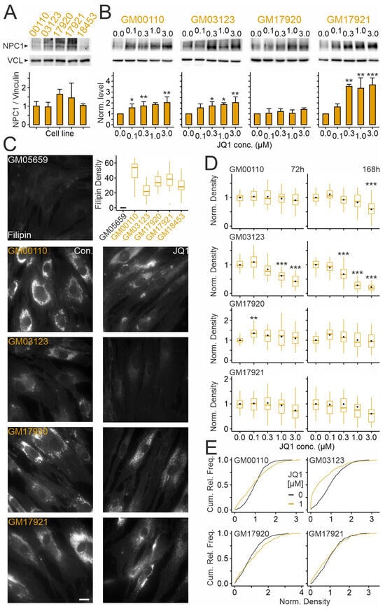 JQ1 enhances NPC1 levels and reduces cholesterol accumulation in cultured skin fibroblasts in a patient-specific manner: (A,B) Levels of NPC1 protein in primary cultures of skin fibroblasts from different NPCD patients under basal levels (A) and after treatment with JQ1 or vehicle (DMSO) at indicated concentrations for 72 h (B). Top, representative images of immunoblots showing bands corresponding to NPC1 and vinculin (VCL). Bottom, column plots in (A,B) showing mean values normalized to VCL levels [(A): n = 4 preparations] and to vehicle-treated (JQ1 concentration zero) control cultures [(B): n = 3–5 preparations], respectively. Asterisks in (B) indicate statistically significant changes compared to vehicle control (*, p < 0.05; **, p < 0.01; ***, p < 0.001; one-way ANOVA with Tukey’s post hoc test). (C) Fluorescence micrographs of cultured fibroblasts from a healthy donor and from different NPCD patients (indicated by codes) showing basal levels of unesterified cholesterol without (left; Con) and with JQ1 treatment (right; JQ1; 3 µM for 168 h). Cells were subjected to chemical fixation and cytochemical staining with filipin. Scale bar: 20 µm. Boxplots showing densities of filipin-positive puncta in somata of the different fibroblast lines under untreated conditions (GM05659: n = 502 ROIs; GM00110: n = 664; GM03123: n = 568; GM17920: n = 647; GM17921: n = 487; GM18453: n = 596; 41–45 images per line; 9–12 images per preparation; 4 preparations each). (D) Boxplots showing densities of filipin-positive puncta in fibroblasts from indicated patients following treatment with JQ1 at indicated durations and concentrations. Density values were normalized to the means of vehicle-treated (JQ1 concentration zero) cultures. Black circles indicate mean values. Asterisks indicate statistically significant changes (**, p < 0.01; ***, p < 0.001; one-way ANOVA with Tukey’s post hoc test; GM00110: 72 h: n = 481–659 ROIs, 32 images per conc., 8–34 ROIs per image; 168 h: 500–653 ROIs, 31–32 images per conc., 1–37 ROIs per image; GM03123: 72 h: 418–673 ROIs, 31–32 images, 8–33 ROIs per image; 168 h: n = 456–629, 28–32 images, 7–33 ROIs per image; GM17920: 72 h: n = 329–505 ROIs, 30 images, 3–23 ROIs per image; 168 h: n = 297–436 ROIs, 30 images, 4–21 ROIs per image; GM17921: 72 h: 263–338 ROIs, 30 images, 4–21 ROIs per image; 168 h: 249–354 ROIs, 29–30 images, 2–23 ROIs per image; 9–12 images per preparation, condition and line; n = 3 preparations per patient line). (E) Cumulative relative frequency plots showing densities of filipin-positive puncta in indicated fibroblast lines following treatment for 72 h with vehicle (DMSO) or JQ1 at 1 µM [subset of data shown in (D)]. Note that in nearly all lines, JQ1 induced dual effects by increasing and decreasing puncta densities.