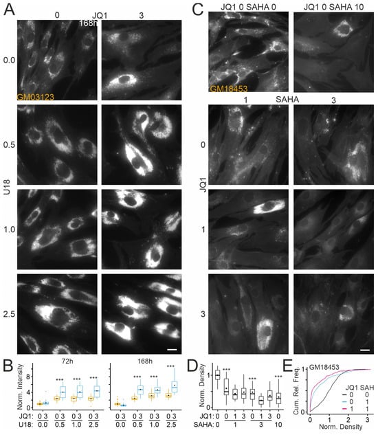Effects of JQ1 on cholesterol accumulation in cultured skin fibroblasts in the presence of the NPC1 inhibitor U18 or of an HDAC inhibitor: (A) Fluorescence micrographs of cultured fibroblasts from a NPCD patient (GM03123) treated for 168 h with vehicle (DMSO/ethanol) or with U18 (microgram per mL) and JQ1 (micromolar) at indicated concentrations. Following treatments, cells were subjected to chemical fixation and cytochemical staining with filipin. Scale bar: 20 µm. (B) Boxplots showing fluorescence intensities of filipin in somata of fibroblasts treated for indicated durations with the indicated drug combinations. Intensity values were normalized to the means of vehicle-treated (JQ1 and U18 concentration zero) cultures. Black circles indicate mean values. Asterisks indicate statistically significant changes induced by JQ1 on U18-treated cells (***, p < 0.001; two-way ANOVA with Tukey’s post hoc test; 72 h: n = 406–818 ROIs, 37–40 images per condition, 2–92 ROIs per image; 168 h: 344–739 ROIs, 28–45 images per condition, 1–73 ROIs per image; 3 preparation). (C) Fluorescence micrographs of cultured fibroblasts from a NPCD patient (GM18453) treated for 72 h with indicated combinations of SAHA and JQ1 at micromolar concentrations. Following treatments, cells were subjected to chemical fixation and cytochemical staining with filipin. Scale bar: 20 µm. (D) Boxplots showing densities of filipin-positive puncta in somata of fibroblasts treated with the indicated drug combinations. Co-treatment with JQ1 and 10 µM SAHA was toxic to cells, precluding further analyses. Density values were normalized to the means of vehicle-treated (JQ1 and SAHA concentration zero) cultures. Black circles indicate mean values. Asterisks indicate statistically significant changes induced by SAHA compared to vehicle-treated cells (***, p < 0.001; two-way ANOVA with Tukey’s post hoc test; n = 368–605 ROIs, 29–40 images per conc., 6–29 ROIs per image). (E) Cumulative relative frequency plots showing densities of filipin-positive puncta in the patient-derived fibroblast line following indicated treatments for 72 h. Note the dual effect of SAHA, similar to that observed for JQ1 (Figure 5D and Figure 6E), and additive effects of SAHA and JQ1. Subsets of data are shown in panel (D).