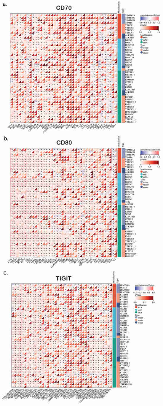 The heatmap shows the profile of correlations between RNA methylation genes (writers, readers, and erasers) and the expression of CD70 (a), CD80 (b), and TIGIT (c) in pan-cancer. *, p < 0.05.