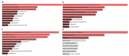 GO biological process (a), molecular function (b), cellular component (c), and KEGG pathway analysis (d) of the m6A/m5C/m1A genes. Τhe bar graphs are sorted by the combined score. The length of each bar represents the significance of the corresponding term. The brighter the color of the bar, the more significant the corresponding term is.