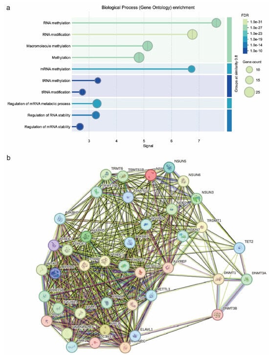 Regarding the cellular components in which these genes are localized, the top enriched GO terms suggest that these enzymes primarily function in nuclear and cytoplasmic compartments, influencing m6A RNA methylation, RNA stability, and translation control. In the number one spot is the RNA N6-methyladenosine (m6A) methyltransferase complex (Figure 2b). Key components of this compartment are METTL3, METTL14, WTAP, and RBM15. It is present mainly in the nucleus, where it modifies immune-related transcripts, potentially influencing checkpoint expression and immune evasion []. Nucleus and intracellular membrane-bounded organelles are the second site, essential for the localization of these enzymes. Nucleus is the main compartment for RNA modification, where all these enzymes, including m6A writers, RBPs, and TET2 operate. Ultimately, we conducted GO molecular function enrichment analysis, which highlighted the enzymatic and binding activities of RNA modification-related proteins in cancer, focused mainly on m6A RNA binding, methylation, and translation regulation. These molecular functions verify the critical role of these enzymes in modulating immune checkpoint expression.