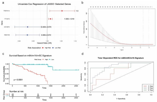 Prognostic modeling of the m6A/m5C/m1A gene signature. (a) Univariate Cox regression analysis of the four selected RNA modification genes across eight TCGA cancer types. (b) LASSO regression and cross-validation plot identifying the optimal λ value and gene subset. (c) Kaplan–Meier survival curves comparing overall survival between high- and low-risk groups (log-rank p < 0.0001). (d) Time-dependent ROC curves for predicting 1-, 3-, and 5-year overall survival (AUC = 0.7091, 0.8719, and 0.8879, respectively).