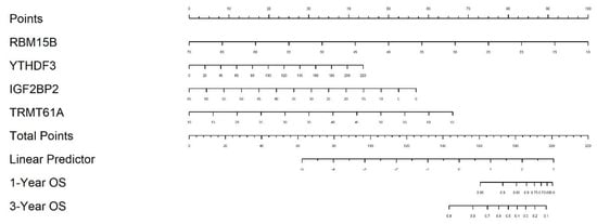 Nomogram for predicting overall survival based on the 4-gene signature. The nomogram integrates the expression of YTHDF3, RBM15B, IGF2BP2, and TRMT61A to predict 1-year and 3-year overall survival in patients across eight TCGA cancer types.
