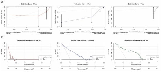 Validation of the prognostic nomogram. (a) Calibration curves for 1-year, 3-year, and 4-year overall survival, showing strong concordance between predicted and observed outcomes. (b) Decision curve analysis (DCA) for 1-year, 3-year, and 4-year OS prediction, demonstrating clinical net benefit of the model across a range of threshold probabilities.