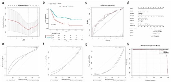 Prognostic model construction and validation for BLCA based on RNA modification-related genes. (a) LASSO Cox regression with 10-fold cross-validation identifies the optimal log(λ) for gene selection. (b) Kaplan–Meier survival curve comparing overall survival between high-risk and low-risk groups (p < 0.0001). (c) Time-dependent ROC curves at 1, 3, and 5 years show predictive performance of the risk model (AUC = 0.68 at 1 year). (d) Nomogram integrating expression of SIX selected genes (NSUN2, IGF2BP2, YTHDC1, ALKBH5, TRDMT1, and ZC3H13) to estimate 1-, 3-, and 5-year overall survival (OS) probabilities. (e–g) Calibration plots for 1-year (e), 3-year (f), and 5-year (g) OS demonstrate agreement between predicted and observed outcomes. (h) Decision curve analysis (DCA) evaluates net benefit of the risk model versus treat-all or treat-none strategies across threshold probabilities.
