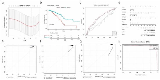 For breast cancer (BRCA), LASSO Cox regression was performed after univariate screening to identify the most prognostic RNA modification-related genes. Using 10-fold cross-validation (Figure 8a), six genes were selected: IGF2BP2, HNRNPC, ALKBH1, METTL16, IGF2BP3, and FTO. These genes span multiple RNA modification pathways and highlight a complex regulatory network associated with patient survival.
