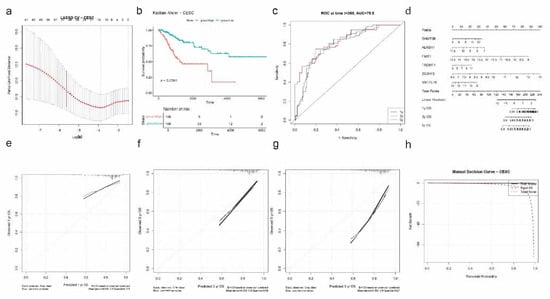 Prognostic model construction and validation for CESC based on RNA modification-related genes. (a) LASSO Cox regression with 10-fold cross-validation selects the optimal log(λ) for gene selection. (b) Kaplan–Meier survival analysis shows a significant difference in overall survival between high-risk and low-risk patients (p < 0.0001). (c) Time-dependent ROC curves at 1, 3, and 5 years indicate strong predictive accuracy, with AUC = 79.8 at 1 year. (d) Nomogram constructed from six selected genes (DNMT3B, ALKBH1, FMR1, TRDMT1, ZC3H13, and METTL16) to estimate individualized 1-, 3-, and 5-year OS probabilities. (e–g) Calibration plots for 1-year (e), 3-year (f), and 5-year (g) OS showing high concordance between predicted and actual survival. (h) Decision curve analysis (DCA) demonstrates that the model provides net clinical benefit over treat-all or treat-none strategies across a range of threshold probabilities.