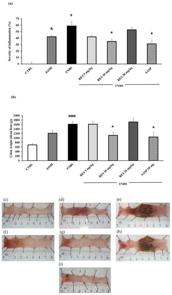 Colitis was induced in rats using TNBS. Macroscopic colonic injuries were analyzed 72 h later. The percentage of the macroscopically visible mucosal injury was expressed as the percentage of the total colonic segmented area (Figure 1a). Moreover, we analyzed the weight of the colon and found this was significantly increased in the TNBS-treated rats compared to the CTRL group (Figure 1b). The dissolvent of TNBS, EtOH, caused marked inflammation and ulceration in the colon compared to the healthy control (Figure 1d). However, the administration of TNBS caused a much more pronounced ulceration of the colon. The 5 (Figure 1f) and 20 mg/kg (Figure 1h) doses of RES did not affect significantly the colonic inflammation compared to TNBS. As was observed pre-treatment with 10 mg/kg, RES significantly diminished inflammation compared to TNBS group (Figure 1g) (34.92 ± 3.64 vs. 58.72 ± 6.64%), an effect which was similar to our positive control. As a positive control, SASP (50 mg/kg/day orally) significantly attenuated the severity of the colonic inflammation (Figure 1i) compared to the TNBS group (Figure 1e) (31.15 ± 6.07 vs. 58.72 ± 6.64%). Representative images of the colons are shown in Figure 1c–i.