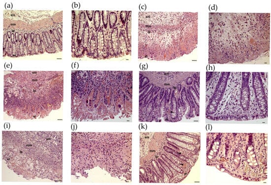 Histopathological changes in rat colon in 2,4,6-trinitrobenzene sulfonic acid (TNBS) model of colitis. Representative images of rat colon after haematoxylin and eosin staining: (a,b) CTRL (no treatment); (c,d) TNBS enema; (e,f) TNBS enema + resveratrol (RES) 5 mg/kg; (g,h) TNBS + RES 10 mg/kg; (i,j) TNBS + RES 20 mg/kg; (k,l) TNBS + sulfasalazine. Arrow: hemorrhage sm: submucosa, mm: muscularis mucosae, lp: lamina propria, el: epithelial layer. Scales: 50 μm (a,c,e,g,i,k), 20 μm (b,d,f,h,j,l).