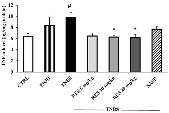 In addition to the antioxidant properties of RES, it should be mentioned that RES has NF-κB transcription factor downregulating effect [,,]. Previous studies reported that RES suppressed the phosphorylation of NF-κB and improved inflammation by regulating the SIRT1/NF-κB pathway [,]. NF-κB has a stimulating effect on the transcription of key pro-inflammatory cytokine genes, such as TNF-α. Our findings have underpinned that TNF-α concentration was significantly higher in the TNBS rats compared to the CTRL group. However, 28 days of 10 mg/kg dose of RES treatment significantly decreased the expression of TNF-α which contributed to the attenuation of the colonic damage. Other data showed that 20 mg/kg RES supplementation was able to diminish TNF-α level in chronic DSS-induced colitis []. In a mouse model of IBD, RES reduced the expression of pro-inflammatory cytokines and significantly decreased disease activity index []. Additionally, a clinical study demonstrated a significant decrease in the level of TNF-α in patients with mild to moderate UC after RES supplementation []. Zhang et al. [] found that RES supplementation for 14 days also reduced the levels of TNF-α in DSS-treated mice.