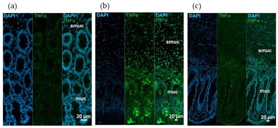 Representative fluorescent micrographs of paraffin sections from (a) control, (b) 2,4,6-trinitrobenzene sulfonic acid (TNBS)-treated, and (c) TNBS + resveratrol (RES) 10 mg/kg rats showing different intestinal layers after TNF-α immunohistochemistry. Nuclei were counterstained with DAPI (blue). muc—mucosa, smuc—submucosa, scale bars: 50 µm.