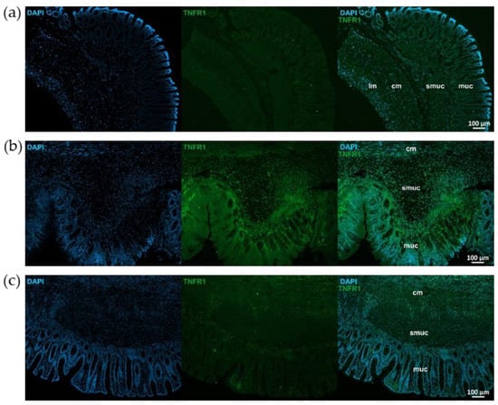 Representative fluorescent micrographs of paraffin sections from control (a), 2,4,6-trinitrobenzene sulfonic acid (TNBS)-treated (b), and TNBS + resveratrol (RES) 10 mg/kg (c) rats showing different intestinal layers after TNFR1 immunohistochemistry. Nuclei were counterstained with DAPI (blue). muc—mucosa, smuc—submucosa, cm—circular smooth muscle, lm—longitudinal smooth muscle, scale bars: 100 µm.