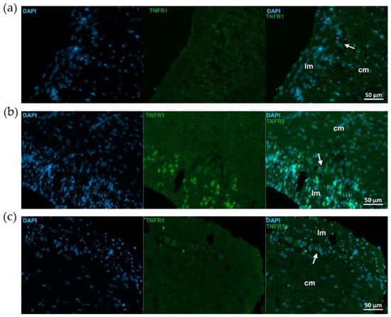 Representative fluorescent micrographs of paraffin sections from control (a), 2,4,6-trinitrobenzene sulfonic acid (TNBS)-treated (b), and TNBS + resveratrol (RES) 10 mg/kg (c) rats showing different intestinal layers after TNFR1 immunohistochemistry. Nuclei were counterstained with DAPI (blue). cm—circular smooth muscle, lm—longitudinal smooth muscle, arrows—myenteric ganglia, scale bars: 50 µm.