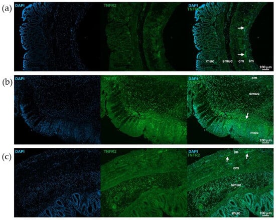 Representative fluorescent micrographs of paraffin sections from control (a), 2,4,6-trinitrobenzene sulfonic acid (TNBS)-treated (b), and TNBS + resveratrol (RES) 10 mg/kg (c) rats showing different intestinal layers after TNFR2 immunohistochemistry. Nuclei were counterstained with DAPI (blue). muc—mucosa, smuc—submucosa, cm—circular smooth muscle, lm—longitudinal smooth muscle, arrows—myenteric ganglia, scale bars: 100 µm.