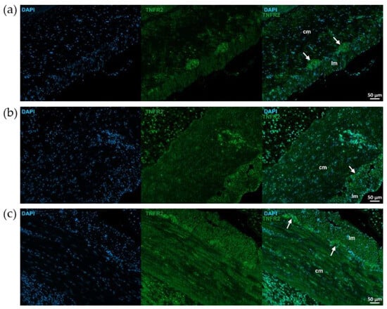 Representative fluorescent micrographs of paraffin sections from control (a), 2,4,6-trinitrobenzene sulfonic acid (TNBS)-treated (b), and TNBS + resveratrol (RES) 10 mg/kg (c) rats showing different intestinal layers after TNFR2 immunohistochemistry. Nuclei were counterstained with DAPI (blue). cm—circular smooth muscle, lm—longitudinal smooth muscle, arrows—myenteric ganglia, scale bars: 50 µm.