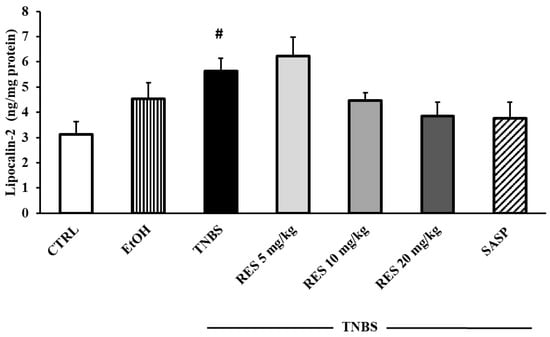 Lcn-2 is involved in the pathogenesis of IBD and is considered a biochemical marker of intestinal inflammation. It is shown that the levels of Lcn-2 correlate with the activity of the disease []. Our results show that Lcn-2 concentration was significantly higher in TNBS-induced colitis. Similarly, another study showed that Lcn-2 expression is increased in the colonic tissues of patients with active IBD []. Moreover, a recent study has demonstrated that Lcn-2 concentration was significantly increased in the colonic tissue of DSS-treated mice []. The administration of 10 mg/kg and 20 mg/kg doses of RES markedly reduced the levels of Lcn-2; however, the differences compared to the TNBS group did not show statistical significance.