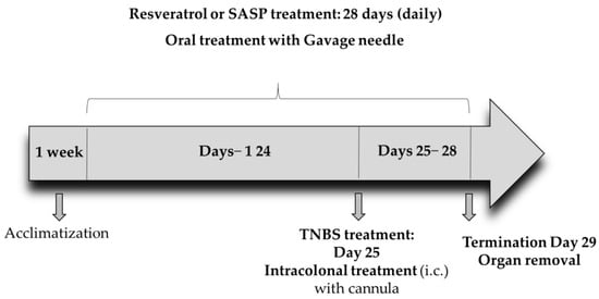 IBD is a chronic inflammatory syndrome, which affects the gastrointestinal tract with inflammation and ulceration. Several polyphenolic compounds with antioxidant and anti-inflammatory properties, such as RES, are currently under intensive investigation as possible adjunctive or self-contained treatment alternatives in IBD []. This study demonstrates that long-term RES treatment can mitigate colonic injury induced by TNBS and reduce the levels of inflammatory parameters.