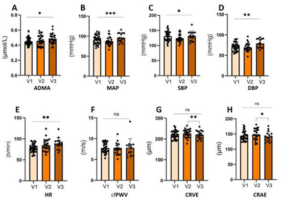 | ADMA (μmol/L) | V1 | 18/100 (0.44 ± 0.03) | 0.231 | 25/100 (0.45 ± 0.05) | 0.020 |