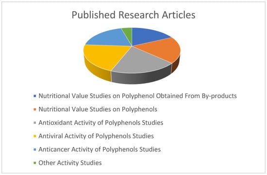 Polyphenols have several nutritional values and health-promoting effects, including antioxidant activity, antiviral activity, and anticancer activity (Figure 2) [43]. Additionally, the polyphenols can be extracted from by-products. This is very important for the economy. The graph demonstrates that recent research articles have focused on certain topics about polyphenols. In the graph, the research articles about nutritional value studies of foods and their by-products, their antioxidant activity, antiviral activity, and anticancer activity are shown.