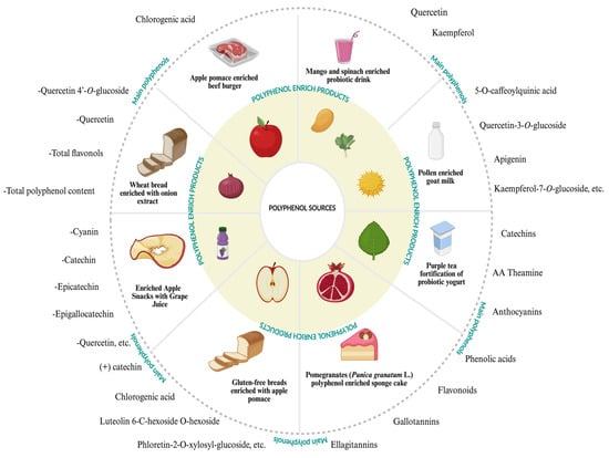 Polyphenols have several health-promoting properties, including anti-aging, anti-inflammatory, and anti-cancer effects [120,121,122]. For these reasons, functional foods and polyphenol-enriched products are manufactured in diets (Table 2) [46,123]. In a study, raspberry polyphenols were added to probiotic dairy products fortified with oat bran, and a functional food was produced for effective diets [123]. Also, this study examined and reported the effect of oat bran and probiotics on polyphenolic ingredients. Antioxidant activity and polyphenols were preserved at the specific storage conditions determined in the study. In another functional food production study, fermented mango (Mangifera indica) and spinach flour (Amaranthus) were used to enrich probiotic drinks in terms of polyphenols [124]. Lactobacillus paracasei was incubated for 60 h in anaerobic conditions at a temperature of 30–32 °C. The polyphenol ingredients of the functional drink were determined by high-performance liquid chromatography. As a result of the study, the anti-diabetic properties, including the ability to improve the lipid profile and stabilize the blood sugar fluctuation in the functional drink, were searched for and determined